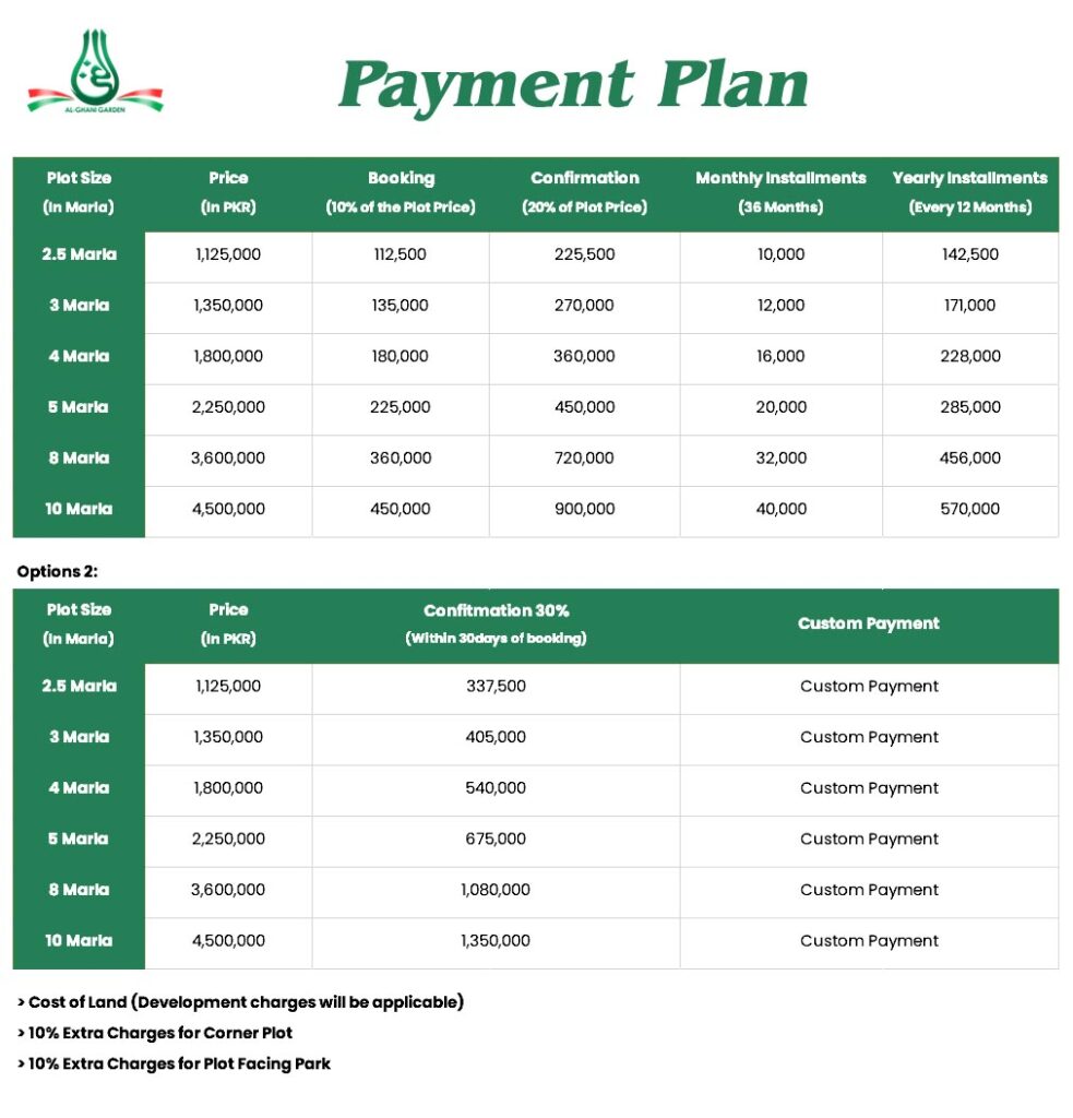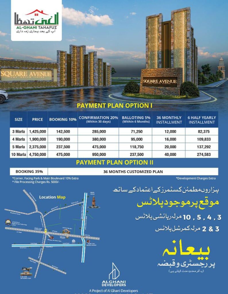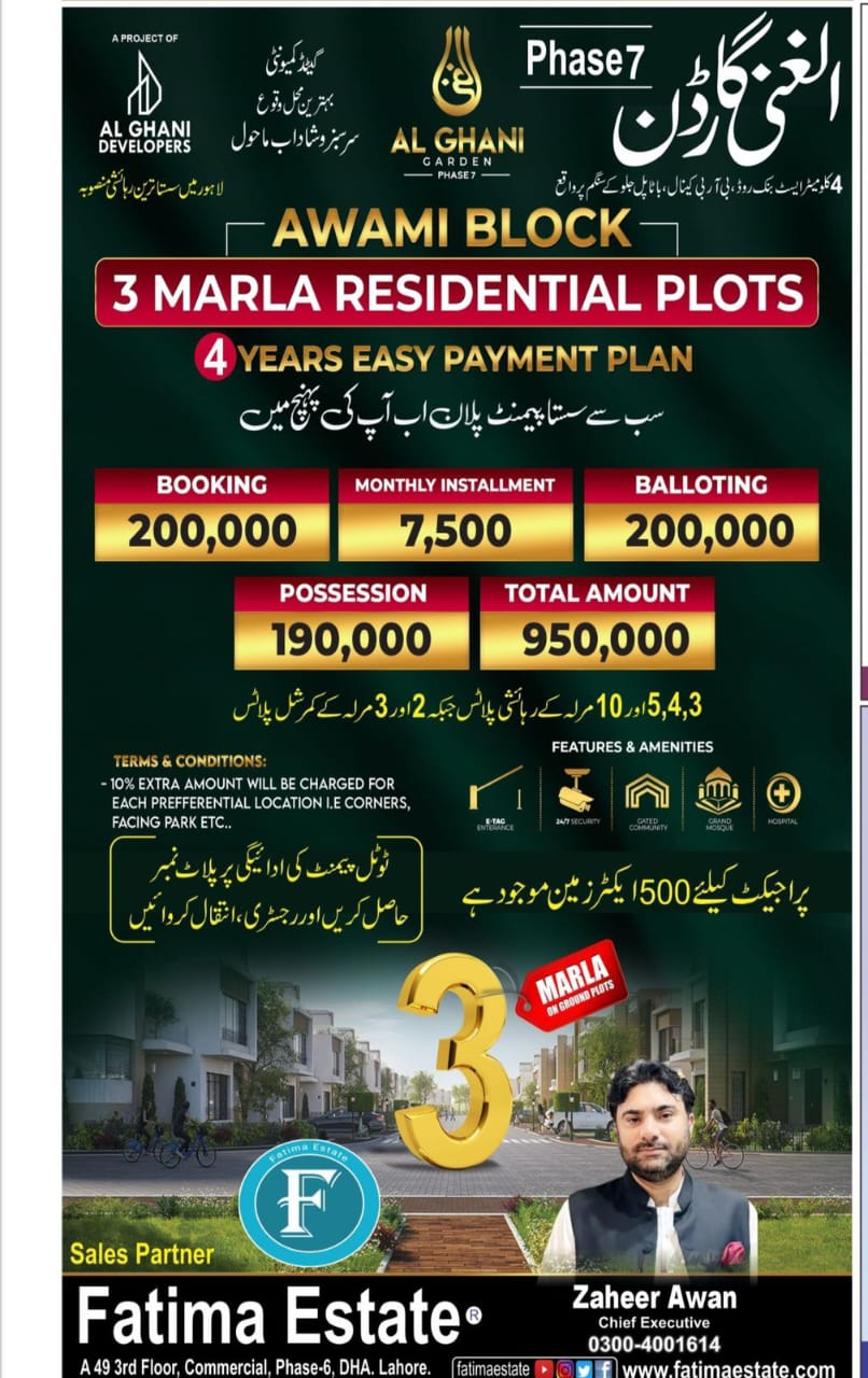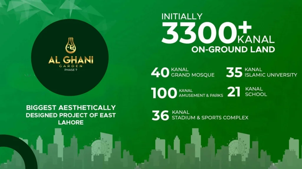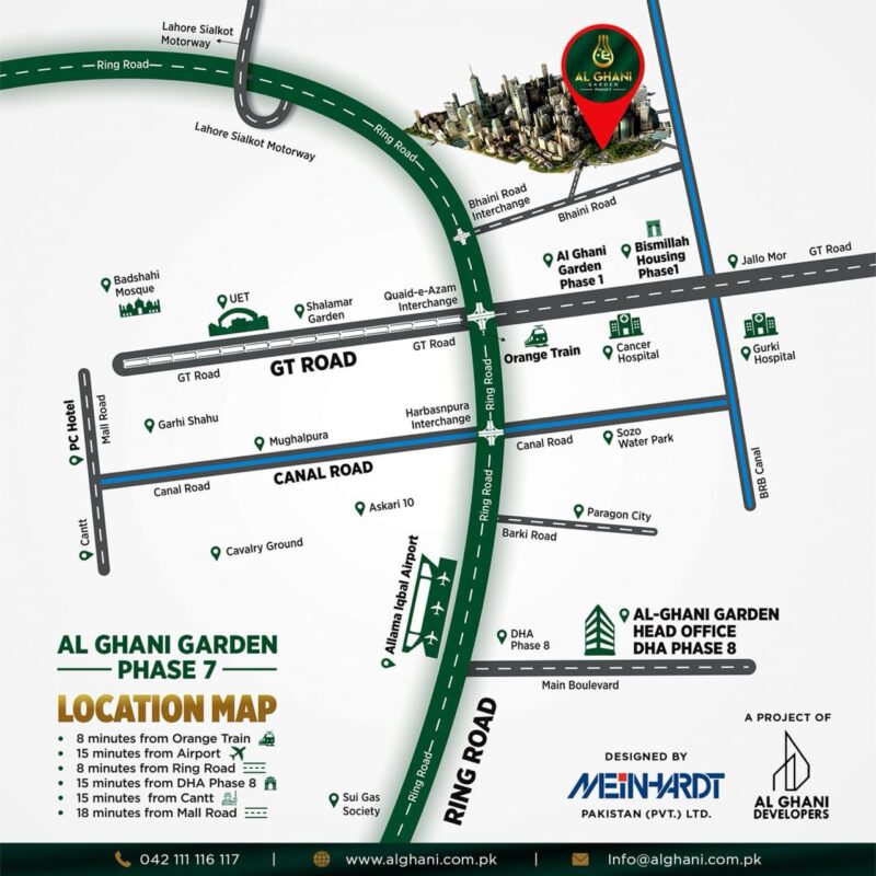 Al Ghani Garden Phase 7, a grand housing initiative by Fatima Estate, is now officially approved by the Town Municipal Administration (TMA) as well as TEPA/LDA, presenting an outstanding investment opportunity in Lahore’s real estate market with plots available on convenient installment plans. Located at the prime site of Bhaini Road, and easily accessible from both Ring Road and GT Road, this development offers unparalleled convenience and connectivity. Residents will benefit from seamless access to major transportation networks, including the Orange Line Train, Metro Bus Service, and Lahore Airport, ensuring effortless commuting and travel.